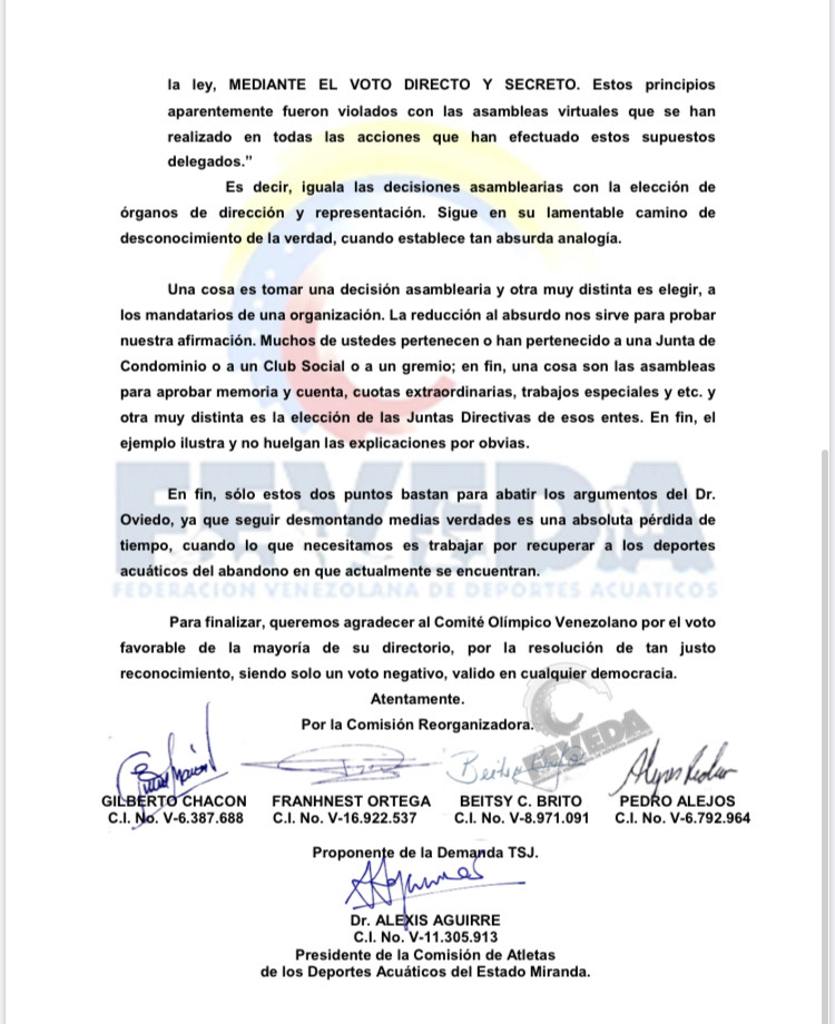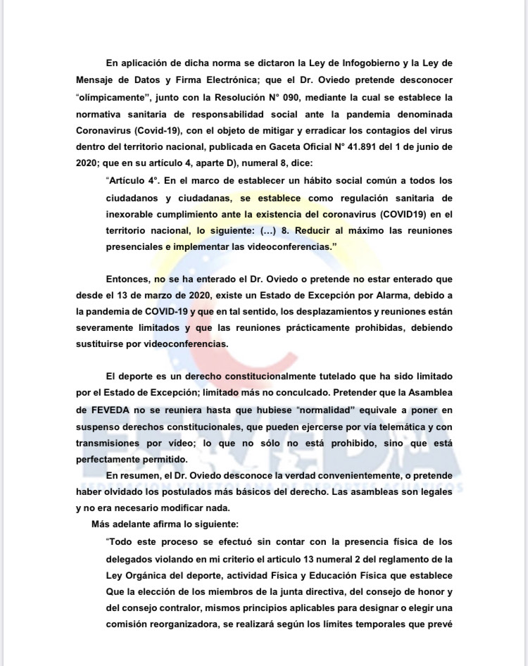 Dlysports La situación de asedios a las asociaciones deportivas en Venezuela continúan haciendo presente en el inicio del año 2021. La junta organizadora de FEVEDA comprendida por 17 asociaciones , representando más del 80 % de la estructura asociativa del país suramericano, repudian la acción del abogado Marcos Oviedo , dirigente del ala opositora en Venezuela que creó alianzas con grupos oficiales para interferir federaciones nacionales , en una fragante acción de asedios que pone en riesgo la institucionalidad deportiva del deporte en Venezuela. Para las autoridades provisionales de la Federación de deportes acuáticos, es sorpresivo la actitud de quien viene formando parte del Comité Olímpico Venezolano y ahora ataca con sus acciones, la propia esencia que rige al movimiento olímpico. A continuación el documento circulado en Venezuela. Fuentes cercana a las autoridades provisionales , aseguran que tanto el Comité Olímpico Venezolano como reuniones ante autoridades de organizaciones internacionales del deporte están al tanto del asedio dirigido contra la Federación Venezolana de Deporte Acuáticos .