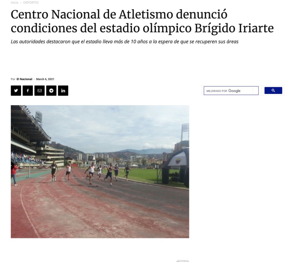 “El presidente Wilfredy León, la junta directiva, las 24 asociaciones que integran la FVA. Y los 650 atletas vieron frustrado su sueño de competir en el Nacional de Especialidades. Desean ver concretado el ofrecimiento de una pista nueva para el atletismo nuestro Brígido Iriarte”. Así lo explicaron las autoridades.