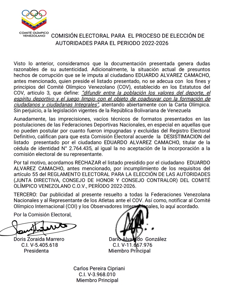 Las amenazas efímeras se hicieron realidad y medios venezolanos reseñaron la llegada de Pedro Infante diputado del PSUV a la asamblea del Comité Olímpico Venezolano, y amenazar a su presidente, humillar a un grupo de federativos, acusándolos de vendidos por 4 lochas y ratificando que en pocas horas el activaría el PODER para lograr sus objetivos de tener el control mediante otras vías que no son las electorales en el Comité Olímpico Venezolano. Momentos en donde Venezuela estaba logrando alegrías para el país, se activa una medida cautelar por hechos de hace más de una década contra el presidente del COV Profesor Eduardo Álvarez Camacho. La medida no surtió el efecto que querían seguramente y las matrices de opiniones apostaron a un evidente pase de factura, por ver inscrito una plancha para su reelección. Ahora el proceso electoral del Comité Olímpico Venezolano está siendo observado por el Comité Olímpico Internacional, donde ya representantes visitaron el país bolivariano y participaron directamente en la asamblea donde se elige una comisión electoral y un padrón de la misma. La comisión electoral según analistas locales está conformada por tres corrientes involucradas en el proceso, para garantizar una elecciones con inclusión y amplitud.